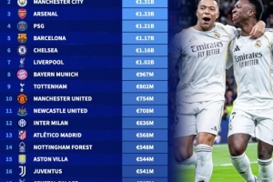 足坛俱乐部最新身价榜:皇马13.4亿欧居首,曼城13.1亿欧次之